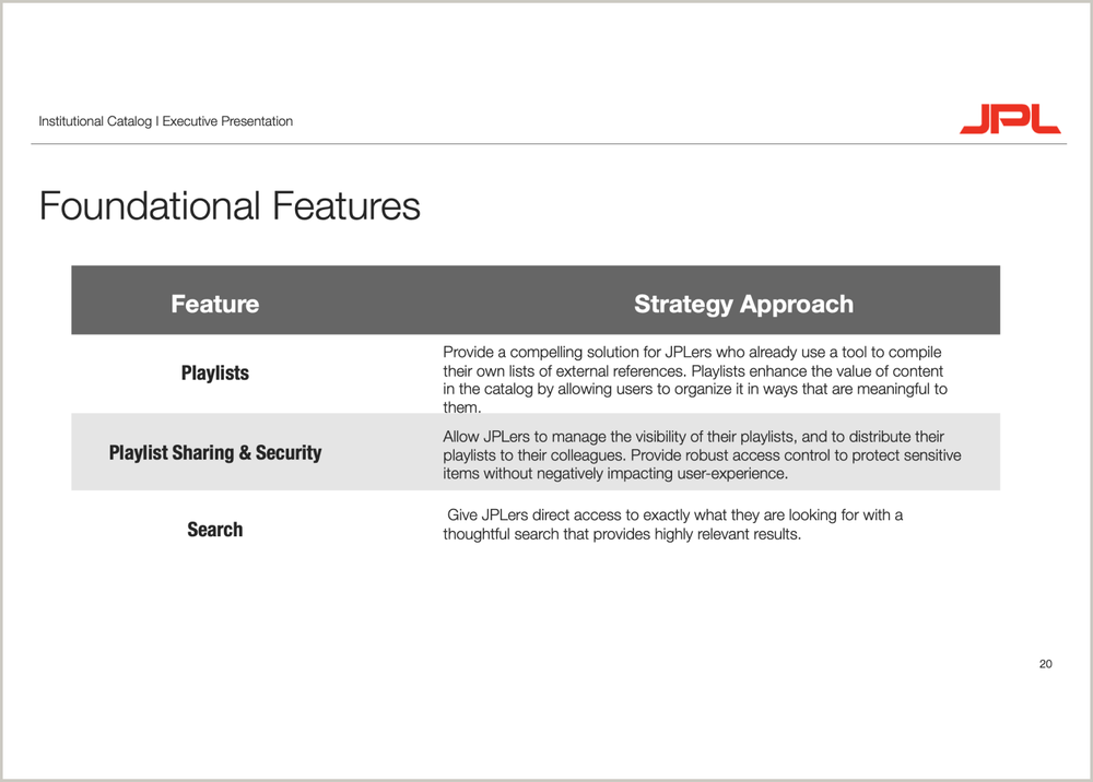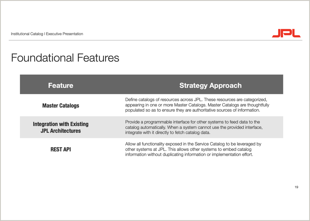 As JPL grew they found collaboration and communication across lab was stymied by a long standing culture of secrecy. In late 2019, JPL’s Office of Digital Transformation engaged Slalom to deliver a informational catalog POC to consolidate and re-design how employees find, access and share programs and content.