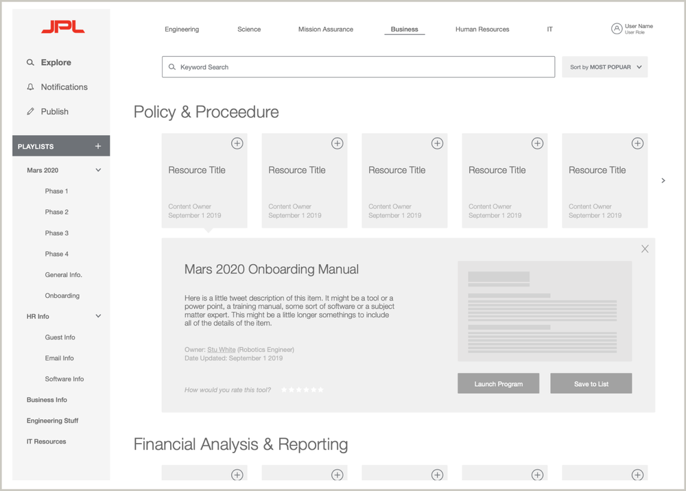 Our proposed solution is intended to sit on top of and source from existing catalogs. As one unified front-end, it would allow employees to easily explore, save, share, and add resources to a collection. Our proposed solution will increase visibility of all resources that are available on lab, promote collaboration, and give visibility to unique JPL made solutions that other mission teams can take advantage of.