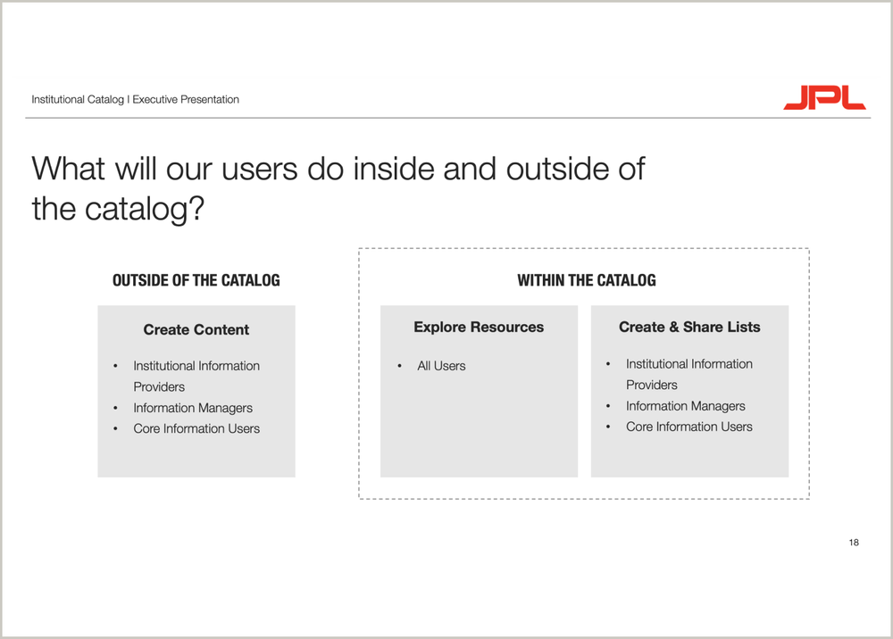 Next, we defined what an ‘institutional catalog’ is, and segmented users based on how frequently we understood they would utilize the solution.