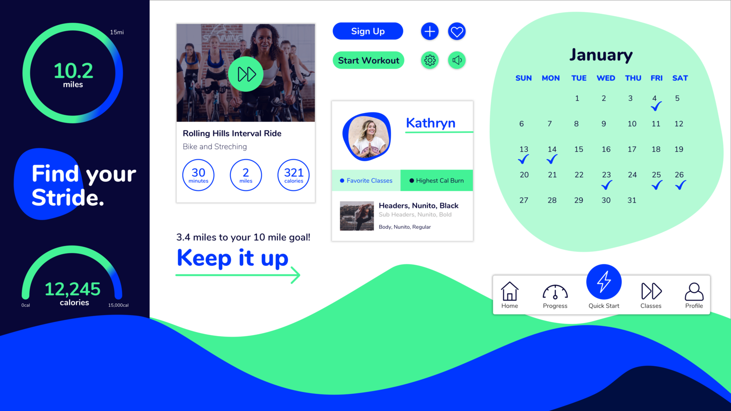 The idea of using exercise as a way to escape their day to day routine and revitalize themselves came up several times in the user interviews. Generous white space gives this concept a fresh look with lots of space to move around, a cool blue color palette, and casual language for an inviting and bubbly experience.