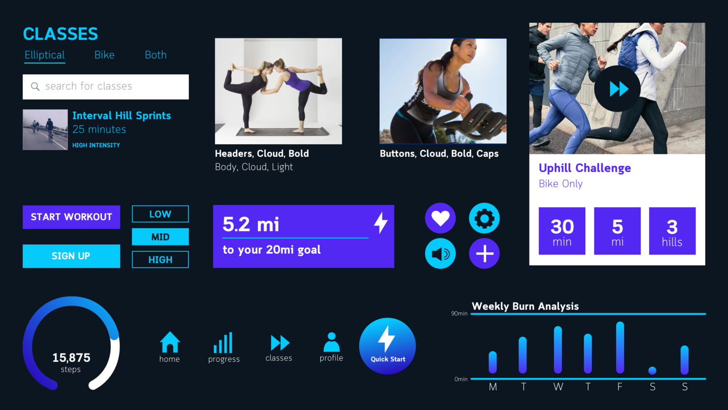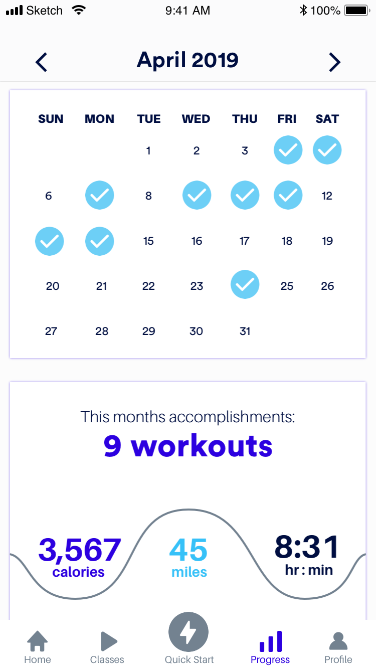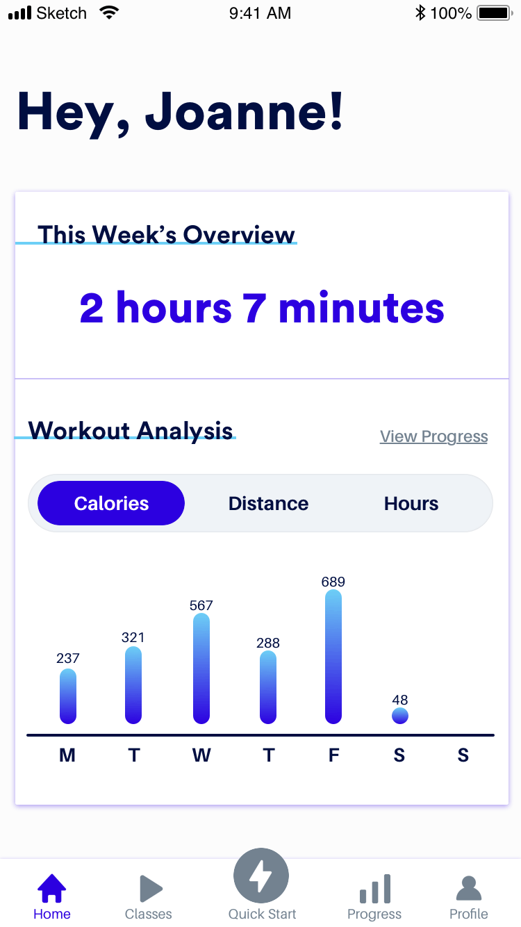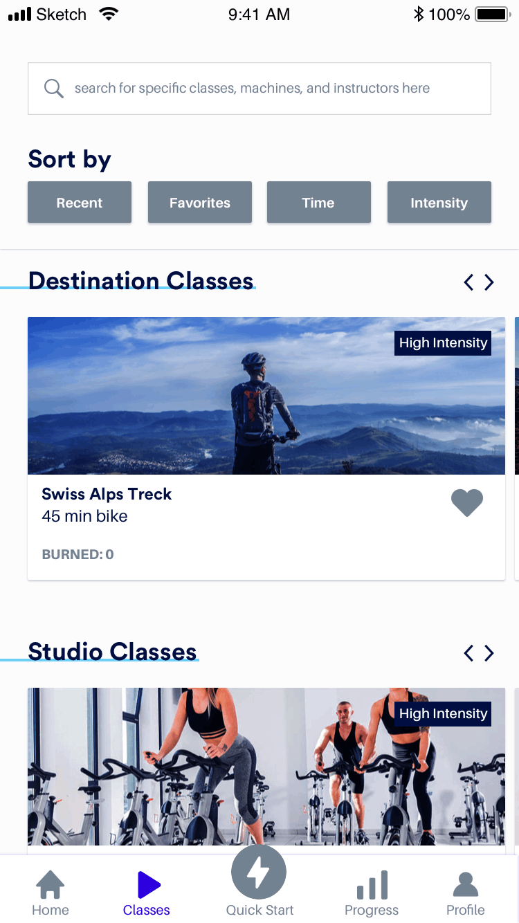 The bottom navigation labels were clear and inline with what users expected to see in the app and on each screen. Some confusion did arise around the quick start button, specifically what would happen if users clicked on it. I solved for this problem in the final prototype by added an intermediary screen where they could set which machine they were on and how long they want to workout.