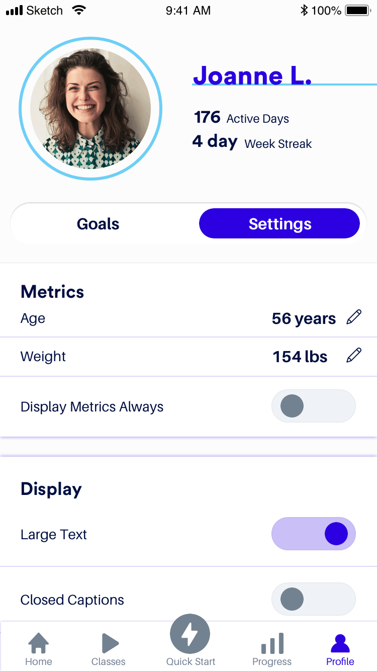 Originally called “Accessibility” users preferred the word “display” when talking about accessibility settings. Also due to user feedback, I added a “metric preference” to this section so users who prefer to see their milage over calories first can control that here.