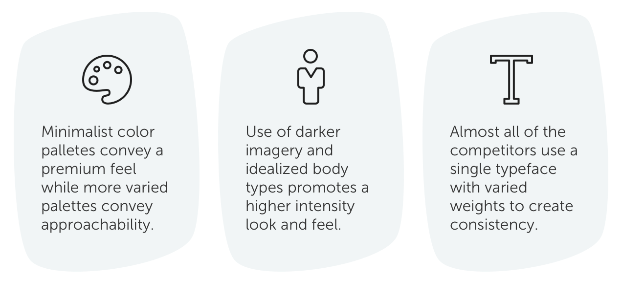 I examined both direct and indirect competitors such as; Strava, Peloton, Nike, etc. as well as a few out of category companies to evaluate the market trends and patterns. Then, I affinity mapped and synthesized our research to determine their strengths and shortcomings.